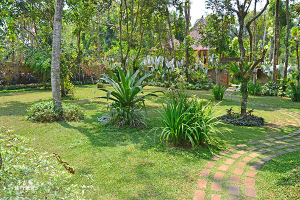 Rumah Boedi 位在一個穆斯林的村子內,在 Progo 河旁邊,距離婆羅浮屠佛塔大概10分鐘車程。當天來到 Borobudur 區時天已經黑了,車窗外什麼都看不見。隱約能感覺到我們正在往比較隱僻的方向開去,路上的屋舍漸少,樹木也變成寒帶樹(尖尖的、不明樹種)。Sewa 說他以前也載過客人來 Rumah Boedi,但是非常少,所以路不是很熟,他一邊跟我們說如果在這裡找不到路回飯店,可以認路上紅色花朵的標示回去。